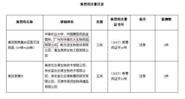 根據(jù)《獸藥管理條例》和《獸藥注冊辦法》規(guī)定,經(jīng)審查,批準華南農(nóng)業(yè)大學等9家單位申報的禽流感病毒H5亞型滅活疫苗(D7株+rD8株)等2種產(chǎn)品為新獸藥,核發(fā)《新獸藥注冊證書》,并發(fā)布產(chǎn)品試行規(guī)程、質(zhì)量標準、說明書和標簽,自發(fā)布之日起執(zhí)行。